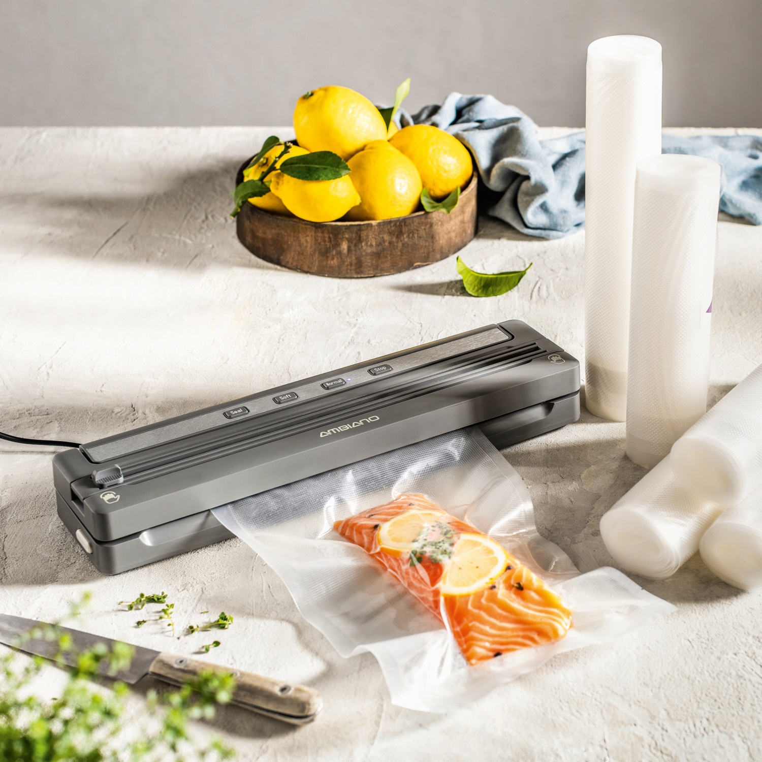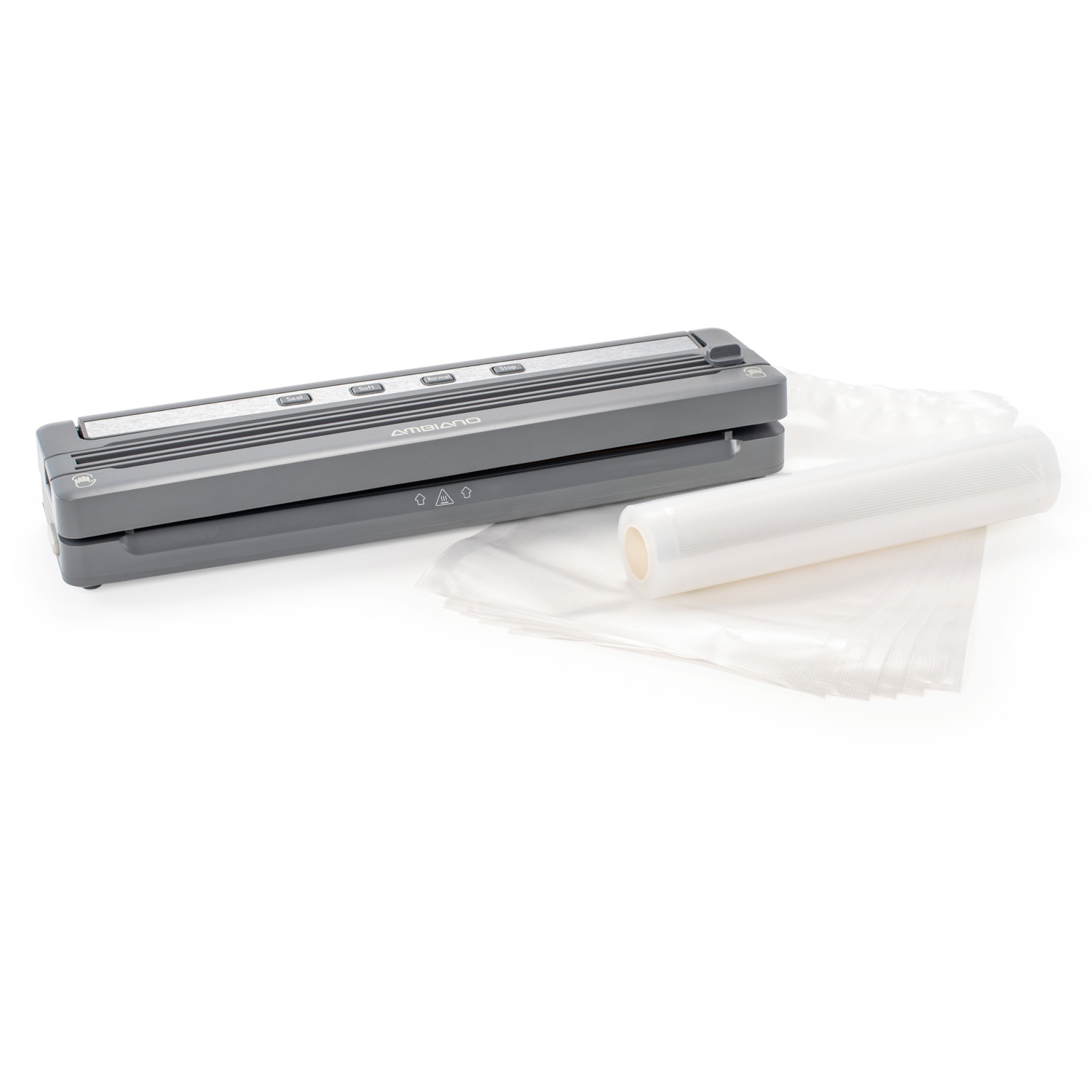 Kit iniziale in dotazione (5 sacchetti per sottovuoto ca. 20 x 30 cm, 1 rotolo di pellicola ca. 22 x 300 cm, 1 guarnizione di ricambio, 1 striscia di gomma di ricambio)
