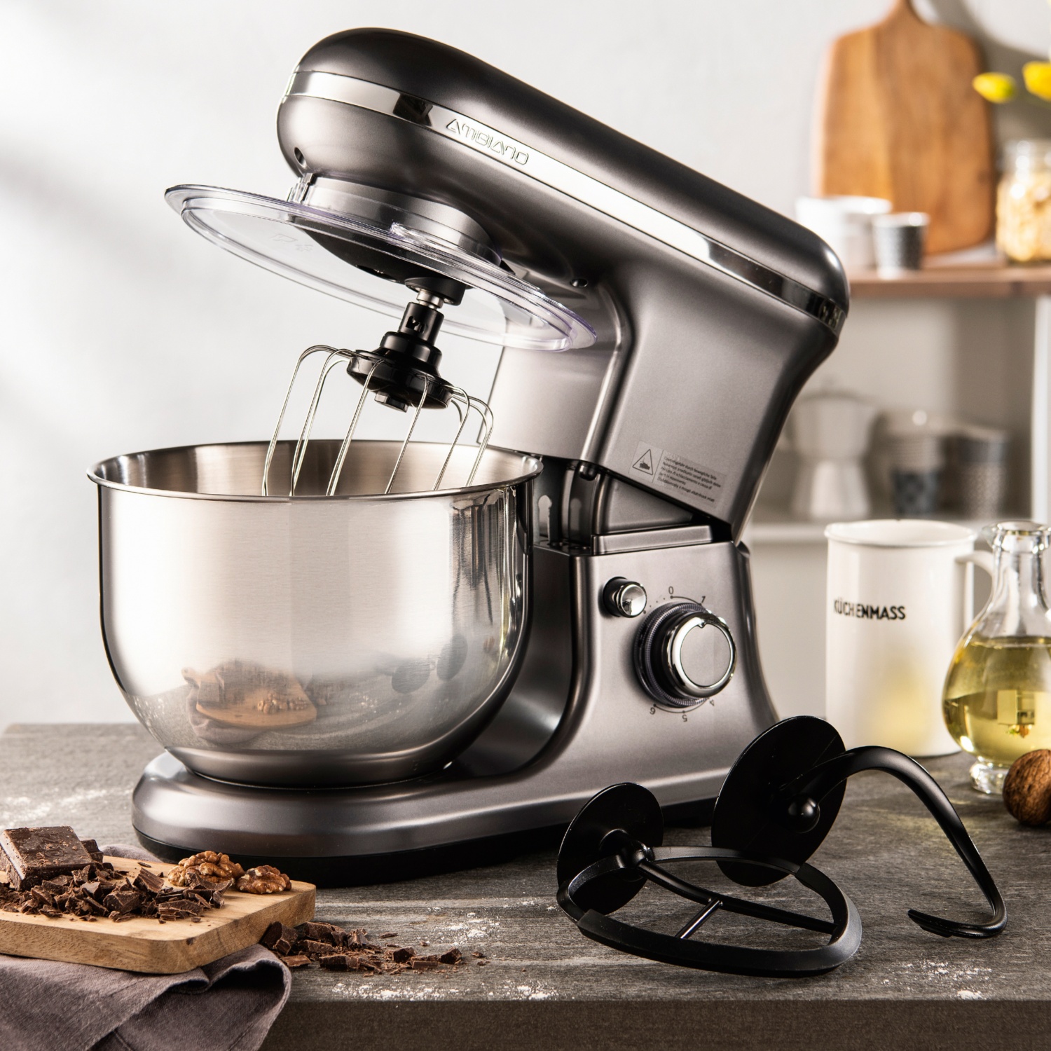 Accessori adatti al lavaggio in lavastoviglie: gancio impastatore, frusta a spirale, frusta francese, paraschizzi
