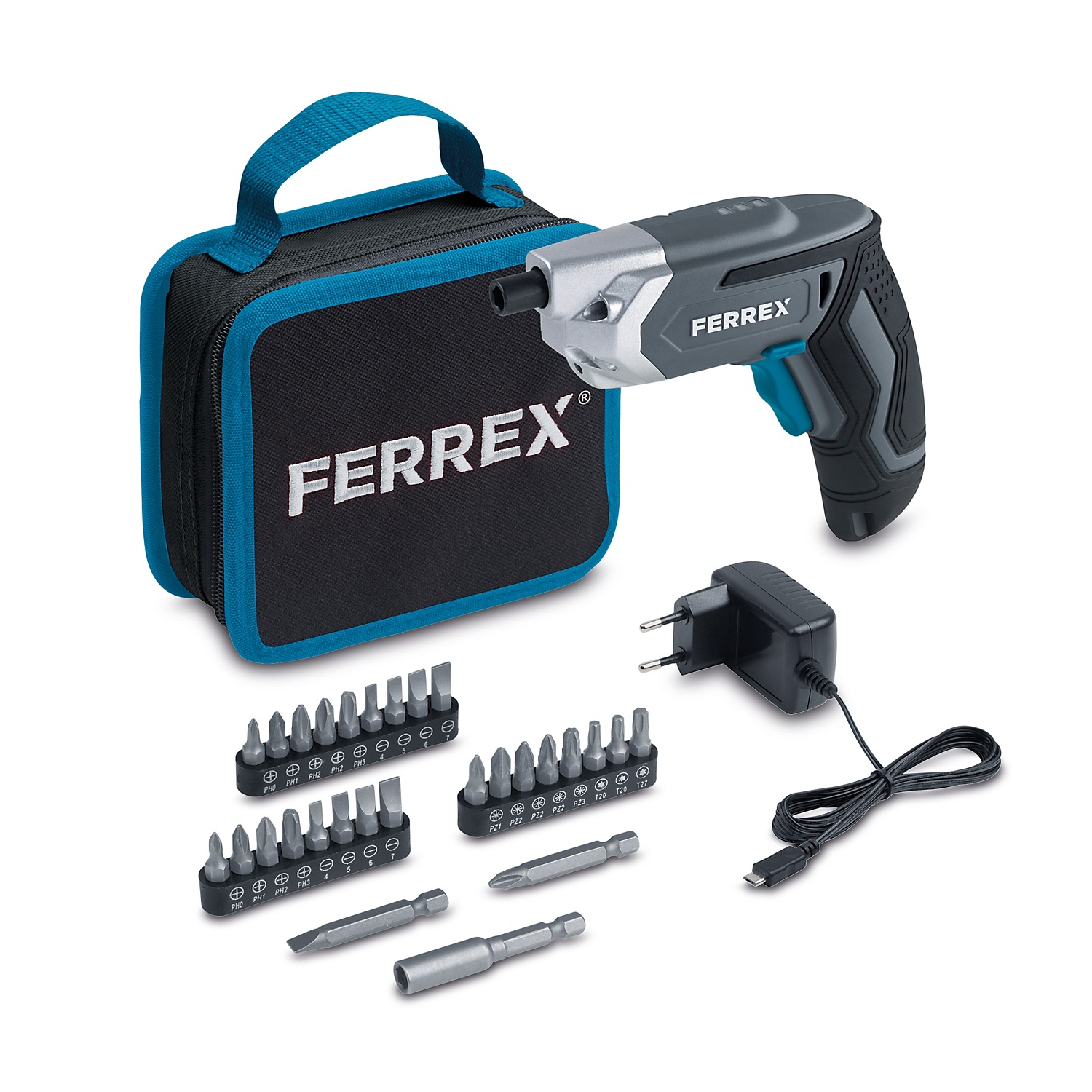 Include set di punte da 28 pezzi, caricabatterie e borsa